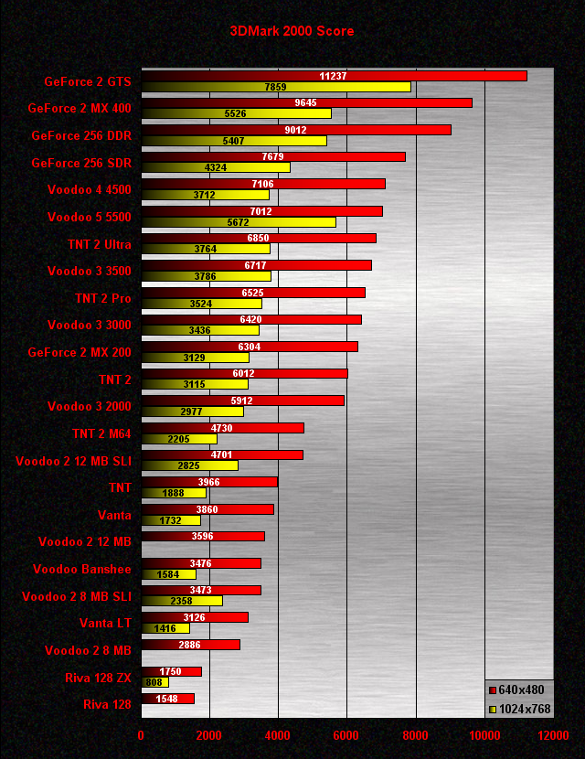 Mint az várható volt, ebben a tesztben a GeForce kártyák dominálnak a Hardware-es T&L miatt. Sorrendjük a papírforma szerint alakul, bár érdekes, hogy a DDR RAM-os GeForce 256 még 1024x768-ban sem tudta megverni a GeForce 2 MX 400-at. Lejjebb haladva különös módon azt tapasztalhatjuk, hogy 640x480-ban a Voodoo 4 4500 megverte a Voodoo 5 5500-at (valószínűleg itt a processzorlimit Hardware-es T&L-t nem tudó kártyák esetén), természetesen 1024x768-ban már jócskán le van maradva, és még a TNT2 Ultra is megelőzte. Az egymás ellenfelének tekinthető TNT2-Voodoo 3 párosok között mindhárom teljesítményszinten minimális a különbség, de mindenhol a TNT2 javára. A GeForce 2 MX 200 HW T&L támogatása ellenére ismét gyalázatosan leszerepel. Az alsóház eredményei érdekesen alakultak. A Voodoo 2 kártyák teljesítménye meglehetősen rossznak mondható, de még ennél is érdekesebb, hogy a 8 MB-os SLI páros gyengébben szerepel a 12 MB-os single kártyánál. A sort a két Riva 128 zárja, mint már korábban említettem, a Voodoo Rush kártyával valamiért nem indult el a 3DMark 2000.