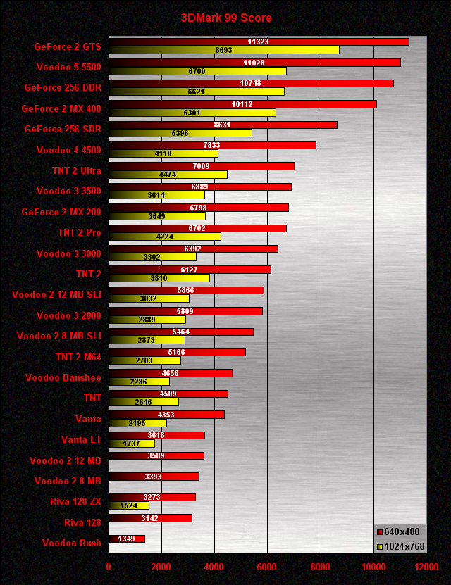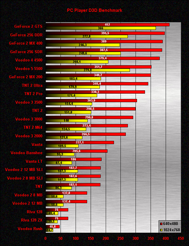 640x480-ban a GeForce kártyák dominálnak, és bár 1024x768-ban a Voodoo 5 5500 fel tudja küzdeni magát a második helyre, lemaradása így is hatalmas. Furcsa hogy 640x480-ban a Voodoo 4 4500 jobban szerepel a Voodoo 5-nél, úgy látszik itt a kétchipes architektúra csak hátráltató tényezőként szerepelt. A Voodoo 3 kártyák eléggé kikapnak a TNT2-ktől, a V3 2000-es még a TNT2 M64-től is, ami azért nem túl fényes eredmény (a Voodoo 3 részéről természetesen). Az SLI-be kötött Voodoo 2-esek se szerepelnek valami jól, még a Vanta LT-től is kikapnak. Érdekes a TNT1 gyenge szereplése is. Az látható, hogy a teszt nem érzékeny a memória méretre, hiszen mind a Voodoo 2, mind pedig a Riva 128 kártyák esetében a több memóriával felszerelt változat nem tudott előnyre szert tenni kisebb testvéréhez képest. A sort ismét a Voodoo Rush zárja, drasztikus lemaradással.