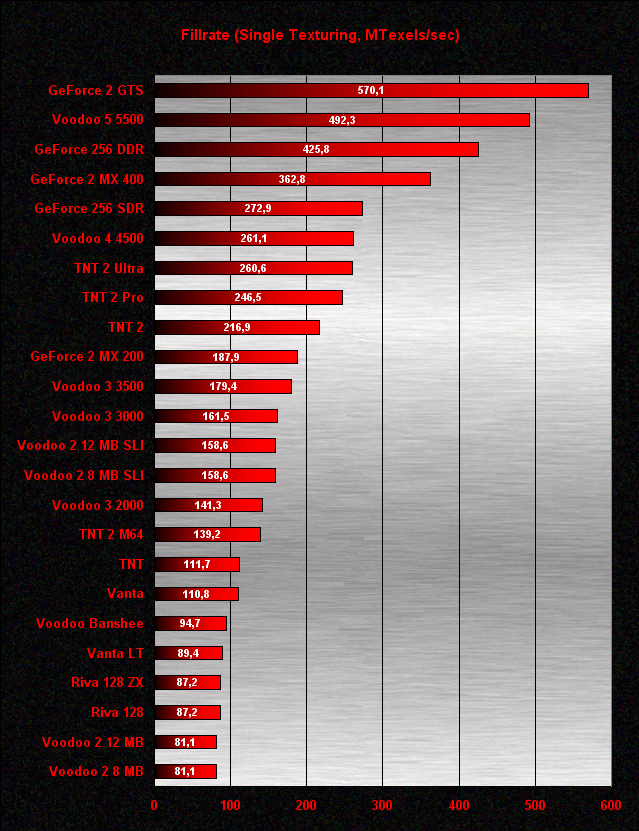 A Fillrate tesztben a GeForce 2 GTS vezeti a sort toronymagasan, mögötte jócskán lemaradva a Voodoo 5 5500, majd pedig nagyjából hasonló mértékű lemaradással a DDR RAM-os GeForce 256, a GeForce 2 MX 400 és az SDRAM-os GeForce 256 következnek. Ezután már tömörebb a sor, a Voodoo 4 4500 és a három legerősebb TNT2 modell minimális különbséggel követi egymást. A VSA-100 architektúra jól vizsgázott a tesztben, mert a két chip összekötésével a fillrate teljesítmény csaknem a duplájára nőtt, igaz ugyanakkor, hogy az egychipes Voodoo 4 nemhogy a GeForce 2 MX-et, de még a TNT2-ket is alig tudta megverni. A 64 bites GeForce 2 MX 200 teljesítménye siralmas, gyengébb az alap TNT2-nél is. A Voodoo 3 modellek a várható erősorrendben követik egymást, közéjük ékelődtek a Voodoo 2 SLI párosok hajszálpontosan megegyező eredménnyel, hiszen a fillrate tesztben a memória méretének nincs jelentősége. A két kártya összekötése itt is csaknem megduplázta az eredményt az egykártyás rendszerhez képest. Érdekes, hogy az egykártyás Voodoo 2-esek még a Riva 128-aknál is gyengébb fillrate-et produkáltak. A Voodoo Rush azért nem szerepel a tesztben, mert a 3DMark 2000 nem volt hajlandó elindulni vele. Az eredményeket összességében szemlélve kijelenthetjük, hogy a 3dfx kártyák mindenhol alulmaradtak nVidiás kihívójukkal szemben, node természetesen a fillrate csak egy a rengeteg teljesítményt befolyásoló tényező közül.