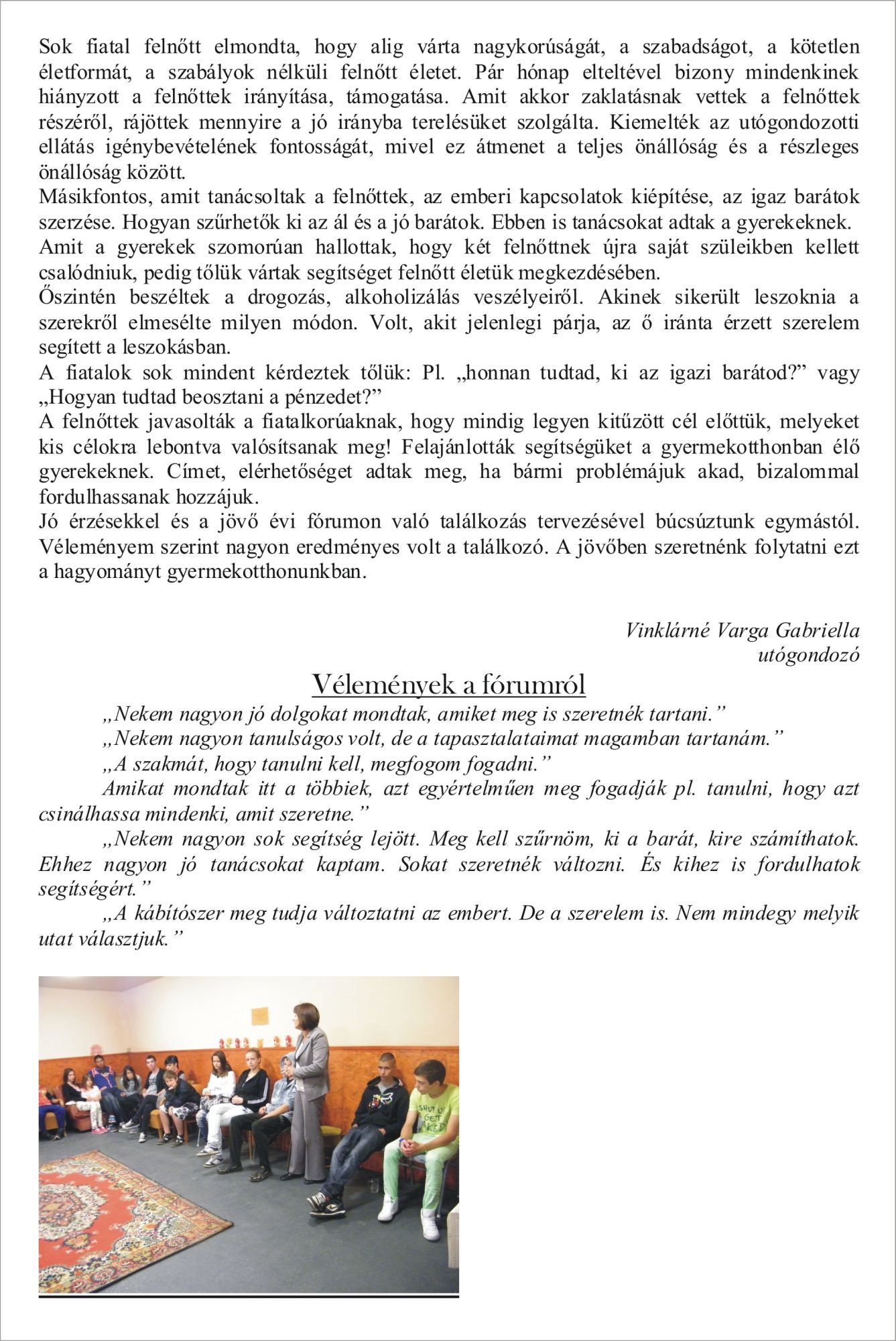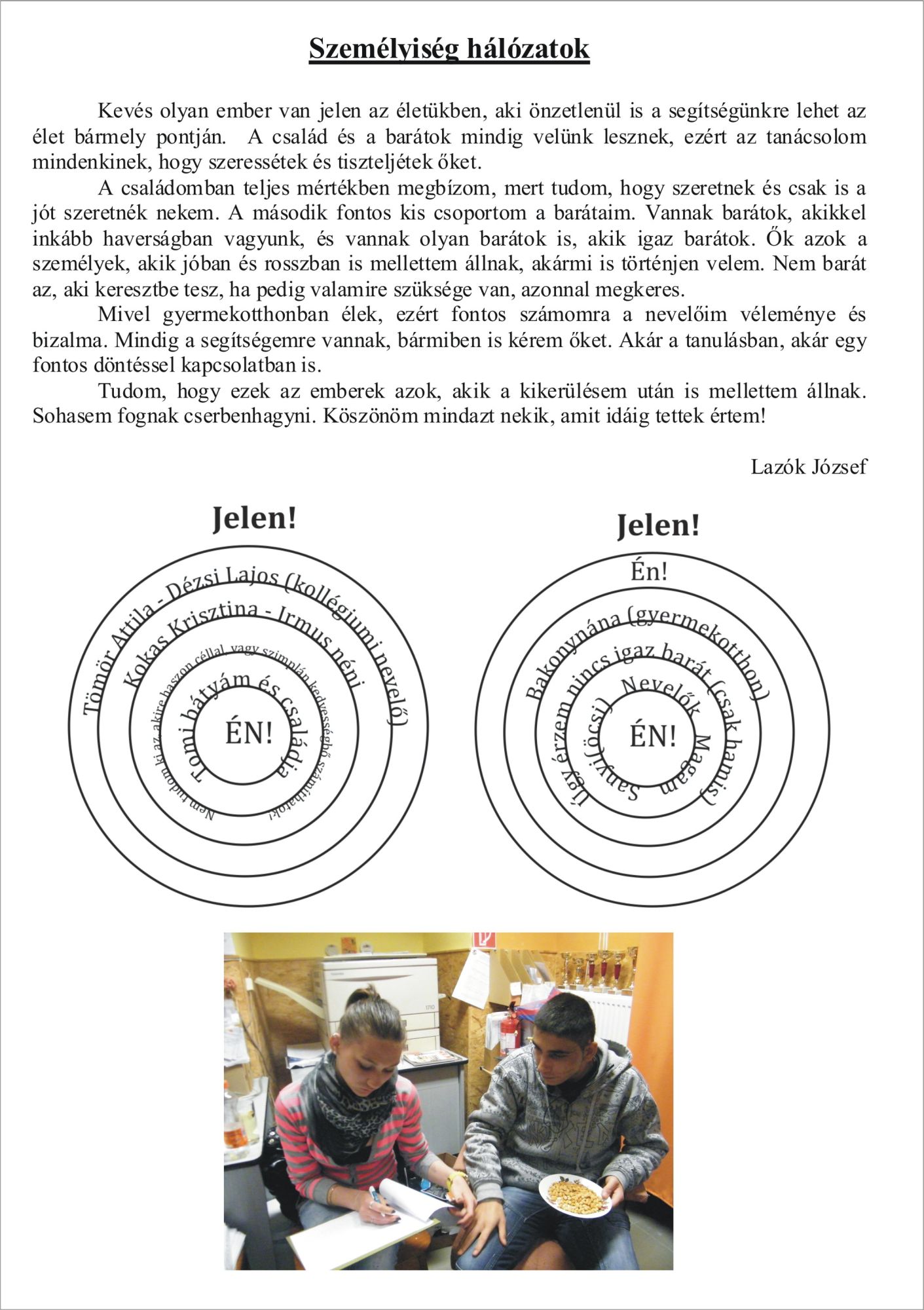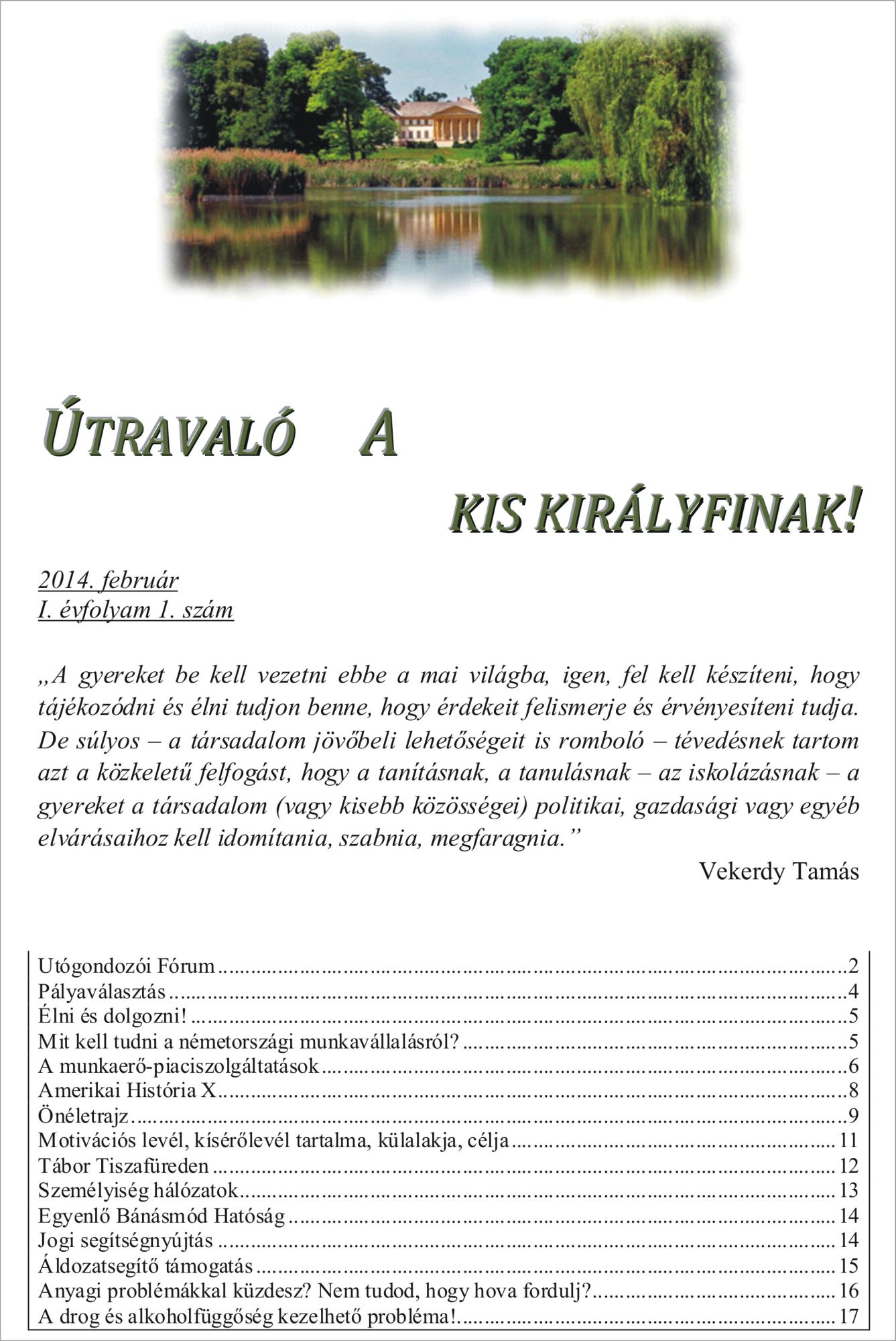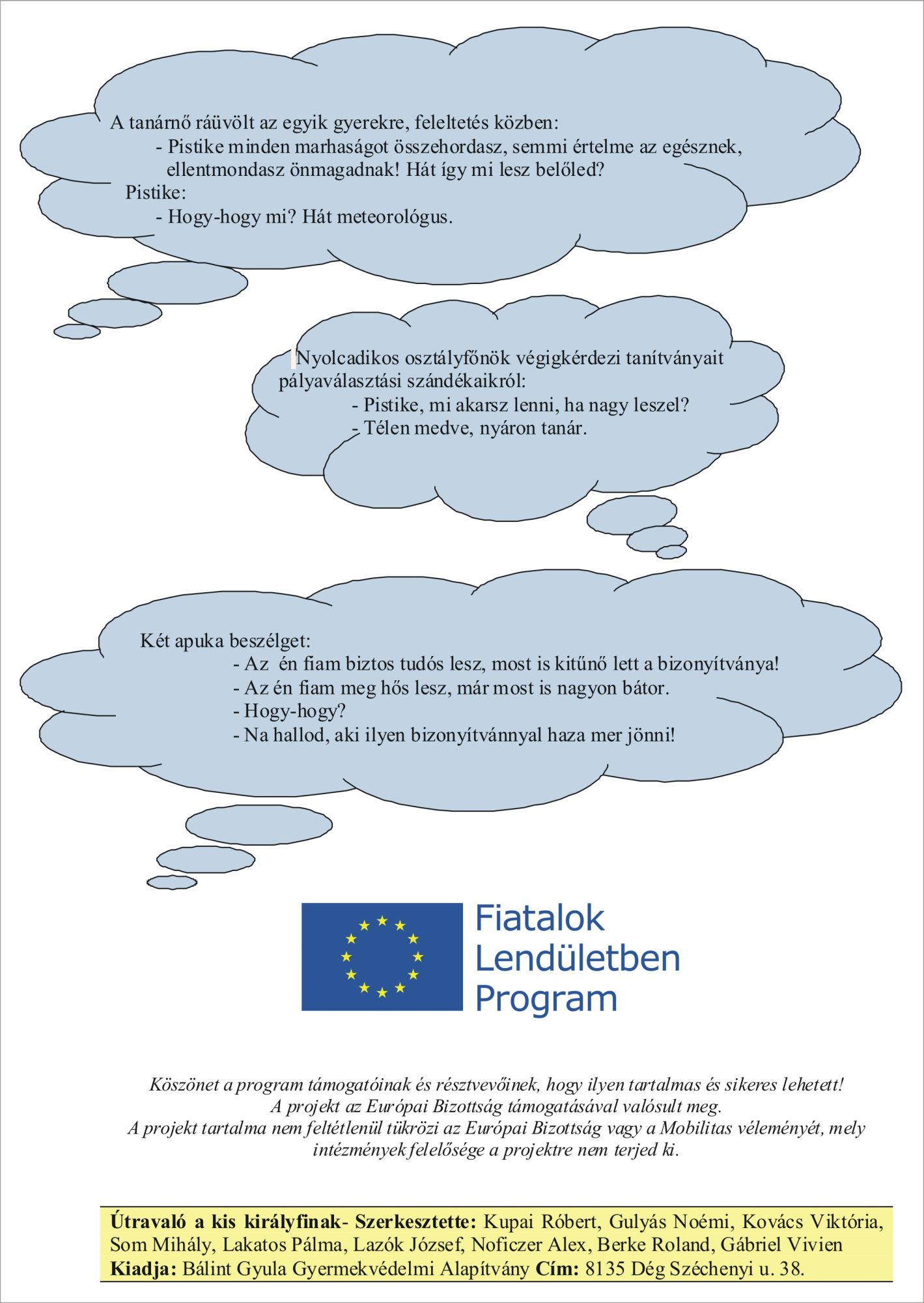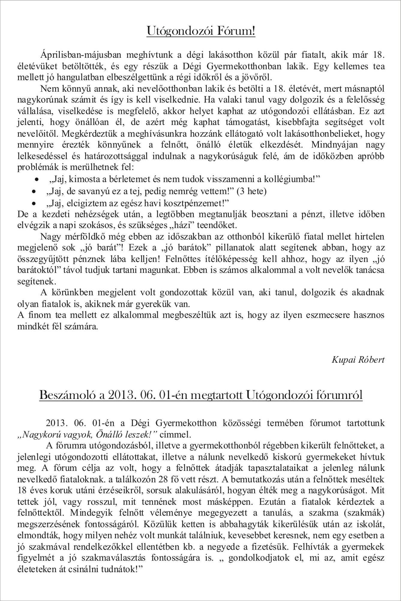 A dégi gyermekotthonban élő fiatalok által kezdeményezett és megvalósított projekt 2013-ban a pályaválasztáshoz, munkavállaláshoz szükséges kompetenciák, ismeretek fejlesztését célozta meg, biztosítva a nagyobb esélyt a munka világában történő majdani elhelyezkedéshez, ezáltal az aktív társadalmi részvételt. Megvalósított tevékenységek: A projekt első harmadában a gyermekotthonból korábban kikerült fiatal felnőttekkel egy információs fórumot szerveztek a fiatalok a tapasztalatok hiteles megosztása érdekében. Ezzel párhuzamosan Film-klub szervezése a projekt teljes szakaszára kiterjedően értékelő beszélgetésekkel összekötve, különböző életutak megismerésével. Majd önmaguk megismerését, céljaik elősegítését segítő joga gyakorlatok elsajátítása következett. Nyáron Tiszafüreden tíz napos tábor keretében a pályaválasztással összefüggő készségfejlesztés majd tapasztalati tanuláson alapuló szabadéri tevékenységek, sportok megismerése következett. (Kenu; gyalogtúrák, kerékpáros túrák, lovaglás.) Szeptembertől mindezt a gyakorlati oldalra átemelve munkák, tevékenységek megismerése történt amelyek alakítják, pontosítják jövőbeli elképzeléseiket. Betekinthettek, tapasztalatot szerezhettek. A projekt utolsó harmadában sor került a személyes életút stratégiák kidolgozására ezzel párhuzamosan a személyes segítő háló felvázolására. A projekt eredményeként elkészítenek egy olyan kiadványt (Útravaló-a kis királyfinak), amely segítséget ad társaiknak a pályaválasztáshoz, életútjuk alakításához.
