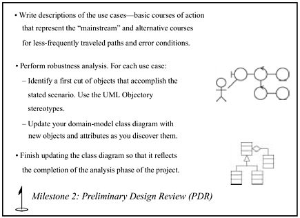 The basic steps that comprise the full ICONIX process and the associated milestones are presented in Figures 1-8 to 1-11. Note that the first three of these diagrams will appear again later in the text, to remind you where we are in the overall process. (We don't talk about implementation in this book, but we do have a chapter about implementation in the original book. Figure 1-11 is here for completeness.)