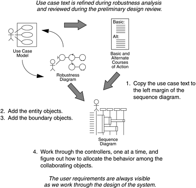 Figure 7-2 shows the four steps you perform when drawing sequence diagrams the ICONIX way.