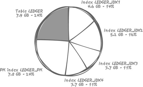3.1. The Identification of "Entry Points"Even before starting to write the very first SQL statement in a program, you should have an idea about the search criteria that will be of importance to users. Values that are fed into a program and the size of the data subset defined lay the foundations for indexing. Indexes are, above all, a technique for achieving the fastest possible access to specific data. Note that I say "specific data," as indexes must be carefully deployed. They are not a panacea: they will not enable fast access to all data. In fact, sometimes the very opposite is the result, if there is a serious mismatch between the original index strategy and the new data-retrieval requirements. Indexes can be considered to be shortcuts to data, but they are not shortcuts in the same sense as a shortcut in a graphical desktop environment. Indexes come with some heavy costs, both in terms of disk space and, possibly more importantly, in terms of processing costs. For example, it is not uncommon to encounter tables in which the volume of index data is much larger than the volume of the actual data being indexed. I can say the same of index data as I said of redundant table data in Chapter 1: indexes are usually mirrored, backed up to other disks, and so on, and the very large volumes involved cost a lot, not only in terms of storage, but also in terms of downtime when you have to restore from a backup. Figure 3-1 shows a real-life case, the main accounting table of a major bank; out of 33 GB total for all indexes and the table, indexes take more than 75%. Let's forget about storage for a moment and consider processing. Whenever we insert or delete a row, all the indexes on the table have to be adjusted to reflect the new data. This adjustment, or "maintenance," also applies whenever we update an indexed column; for example, if we change the value of an attribute in a column that is either itself indexed, or is part of a compound index in which more than one column is indexed together. In practice this maintenance activity means a lot of CPU resources are used to scan data blocks in memory, I/O activity is needed to record the changes to logfiles, together with possibly more I/O work against the database files. Finally, recursive operations may be required on the database system to maintain storage allocations. Figure 3-1. A real-life case: Data versus Index out of a 33 GB total