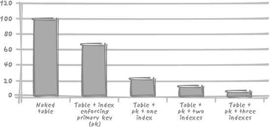 Tests have quantified the real cost of maintaining indexes on a table. For example, if the unit time required to insert data into a non-indexed table is 100 (seconds, minutes, or hoursit does not really matter for this illustration), each additional index on that table will add an additional unit time of anything from 100 to 250. Maintenance costs for one index may exceed those for one table. Although index implementation varies from DBMS to DBMS, the high cost of index maintenance is true for all products, as Figures 3-2 and 3-3 show with Oracle and MySQL. Figure 3-2. The impact of indexes on insertion with Oracle