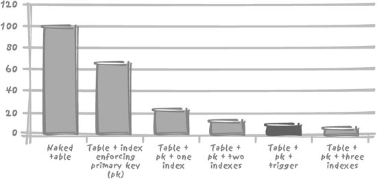 Interestingly, this index maintenance overhead is of the same magnitude as a simple trigger. I have created a simple trigger to record into a log table the key of each row inserted together with the name of the user and a timestampa typical audit trail. As one might expect, performance suffersbut in the same order of magnitude as the addition of two indexes, as shown in Figure 3-4. Recall how often one is urged to avoid triggers for performance reasons! People are usually more reluctant to use triggers than they are to use indexes, yet the impact may well be very similar. Figure 3-4. Comparing the performance impact of indexes and triggers