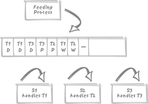 5.8. The Best Way to Partition DataNever forget that what dictates the choice of a nonstandard storage option such as partitioning is the global improvement of business operations. It may mean improving a business process that is perceived as being of paramount importance to the detriment of some other processes. For instance, it makes sense to optimize transactional processing that takes place during business hours at the expense of a nightly batch job that has ample time to complete. The opposite may also be true, and we may decide that we can afford to have very slightly less responsive transactions if it allows us to minimize a critical upload time during which data is unavailable to users. It's a matter of balance. In general, you should avoid unduly favoring one process over another that needs to be run under similar conditions. In this regard, any type of storage that positions data at different locations based on the data value (for example both clustering indexes as well as partitioning) are very costly when that value is updated. What would have previously been an in situ update in a regular table, requiring hardly more than perhaps changing and shifting a few bytes in the table at an invariant physical address, becomes a delete on one part of the disk, followed by an insert somewhere else, with all the maintenance operations usually associated with indexes for this type of operation. Having to move data when we update partition keys seems, on the surface, to be a situation best avoided. Strangely, however, partitioning on a key that is updated may sometimes be preferable to partitioning on a key that is immutable once it has been inserted. For example, suppose that we have a table being used as a service queue. Some process inserts service requests into this table that are of different types (say type T1 to type Tn). New service requests are initially set to status W, meaning "waiting to be processed." Server processes S1 to Sp regularly poll the table for requests with the W status, change the status of those requests to P (meaning "being processed"), and then, as each request is completed its status is set to D for "done." Let's further suppose that we have as many server processes as we have request types, and that each server process is dedicated to handling a particular type of request. Figure 5-5 shows the service queue as well as the processes. Of course, since we cannot let the table fill with "done" requests, there must be some garbage-collecting process, not shown, that removes processed requests after a suitable delay. Figure 5-5. A service queue