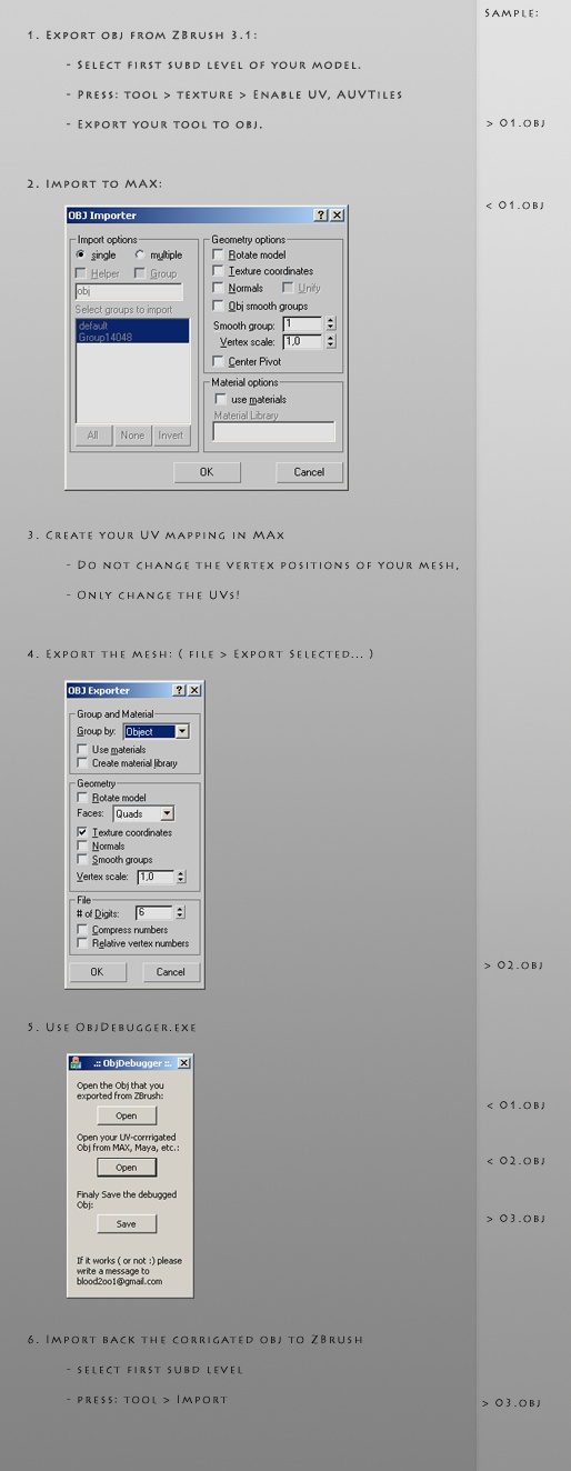 I like to play with ZBrush, and I often make the mistake that I make a model and detail it, but I want to unwrap the UV later in Max or Maya. I've tried a lot of methods, but none of them worked well. If you've made this mistake too, try ObjDebugger!