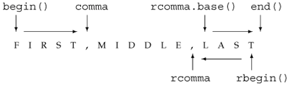 Figure 11.2 illustrates the problem: We are using reverse iterators, and such iterators process the string backward. To get the right output, we need to transform the reverse iterators line.rbegin() and rcomma into normal iterators that go forward. There is no need to transform line.rbegin() as we already know that the result of that transformation would be line.end(). We can transform rcomma by calling base, which is a member of each reverse iterator type: