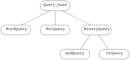 We'll derive WordQuery and NotQuery directly from our abstract base. The AndQuery and OrQuery classes share one property that the other classes in our system do not: They each have two operands. To model this fact, we'll add another abstract class, named BinaryQuery, to our hierarchy to represent queries with two operands. The AndQuery and OrQuery classes will inherit from the BinaryQuery class, which in turn will inherit from Query_base. These decisions give us the class design represented in Figure 15.3 on the next page.