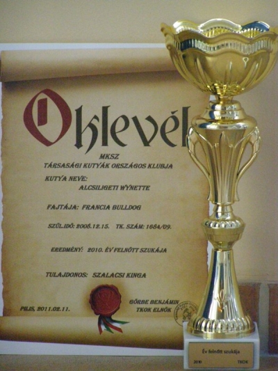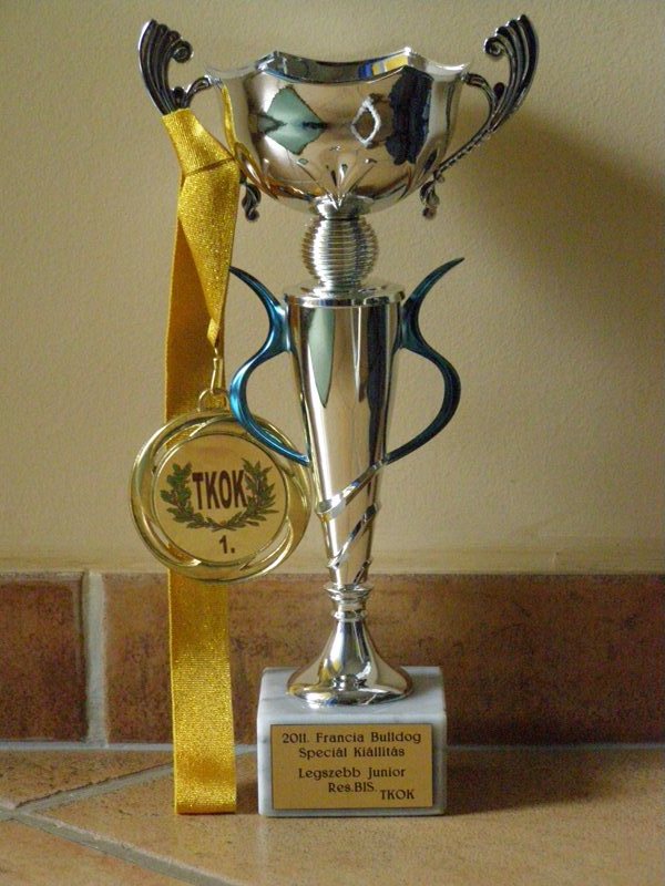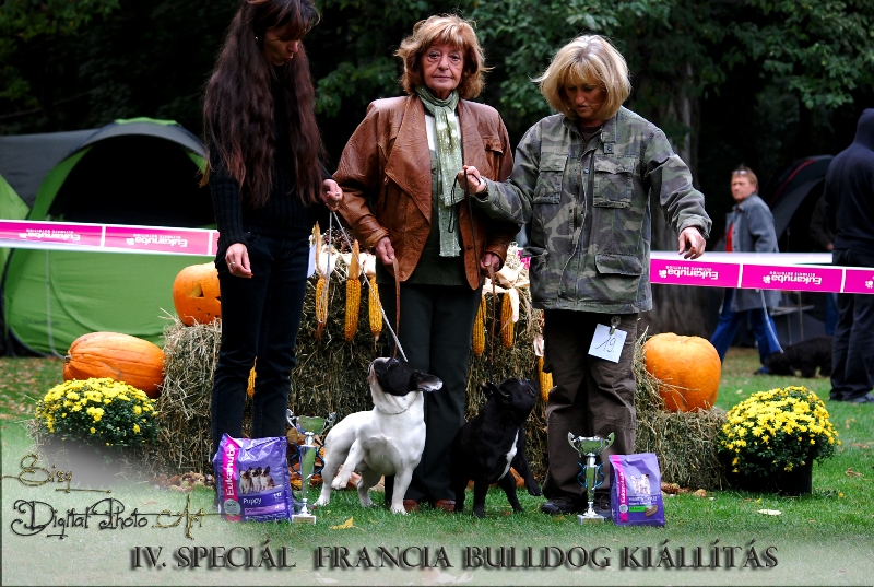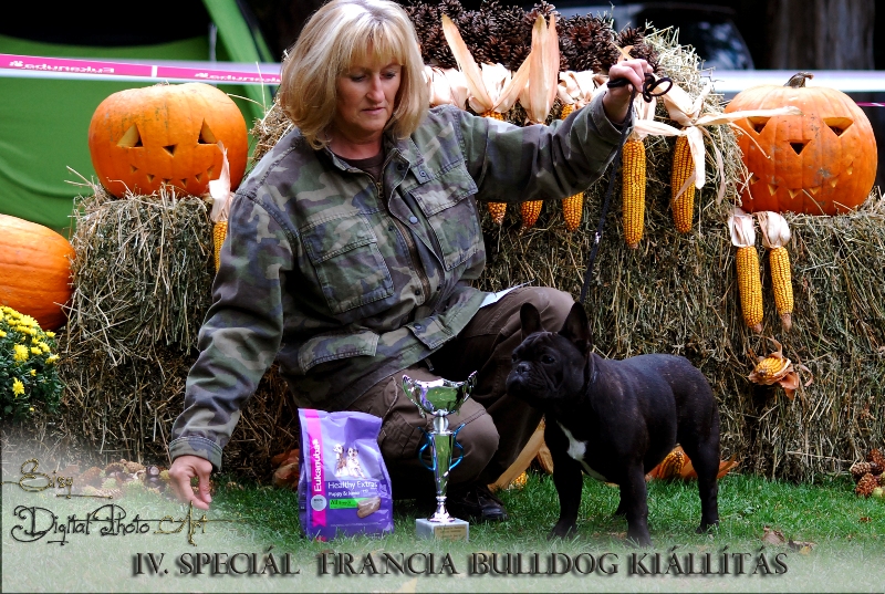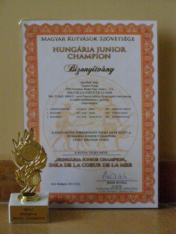 08.10.2011.: Budapest MKSZ TKOK CAC Inka (Brillant De La Coeur De La Mer x HCH Luizador Tsarist Jet) got Exc. 1., Hungária Prima Junior title MKSZ TKOK French bulldog Special Show Inka (Brillant De La Coeur De La Mer x HCH Luizador Tsarist Jet) Exc. 1., HPJ, Junior BIS 2. With this result Inka finished the MKSZ HJCH title!