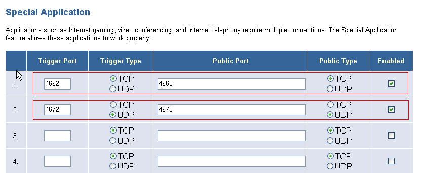 Ha sikerült belépned ebbe az opcióba, egy táblázat tárul eléd, mely első látásra bonyolult lehet, azonban igen egyszerű kitölteni. Az eMule az alap beállítások szerint az 4662-es TCP és a 4672-es UDP portokat használja, előbbit az eD2k rendszer, utóbbit a Kad, ezért most mi is ezeket nyitjuk meg. Ehhez a következőt kell tenned: Az első sorba a "trigger port"-hoz beírod, hogy 4662 a "trigger type"-ot TCP-re állítod, a "public port"-hoz szintén a 4662-őt írod, a "public type"-ot pedig TCP-re állítod, ez után a kis négyzetet kipipálod, tehát "enabled" állásba teszed. Ha ez megvan, a második sorban is hasonlóképp jársz el, csak a port-hoz 4672-őt írsz, és a típusát UDP-re állítod, s a végén ezt is engedélyezed. Ha megvan, akkor az általában az ablak jobb alsó sarkába található "apply" gombbal engedélyezed az összes beírt információt. Kép, hogy körülbelül hogy kell kinéznie: itt