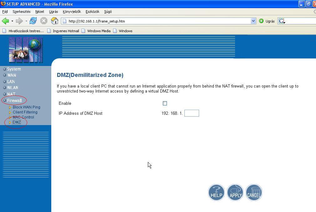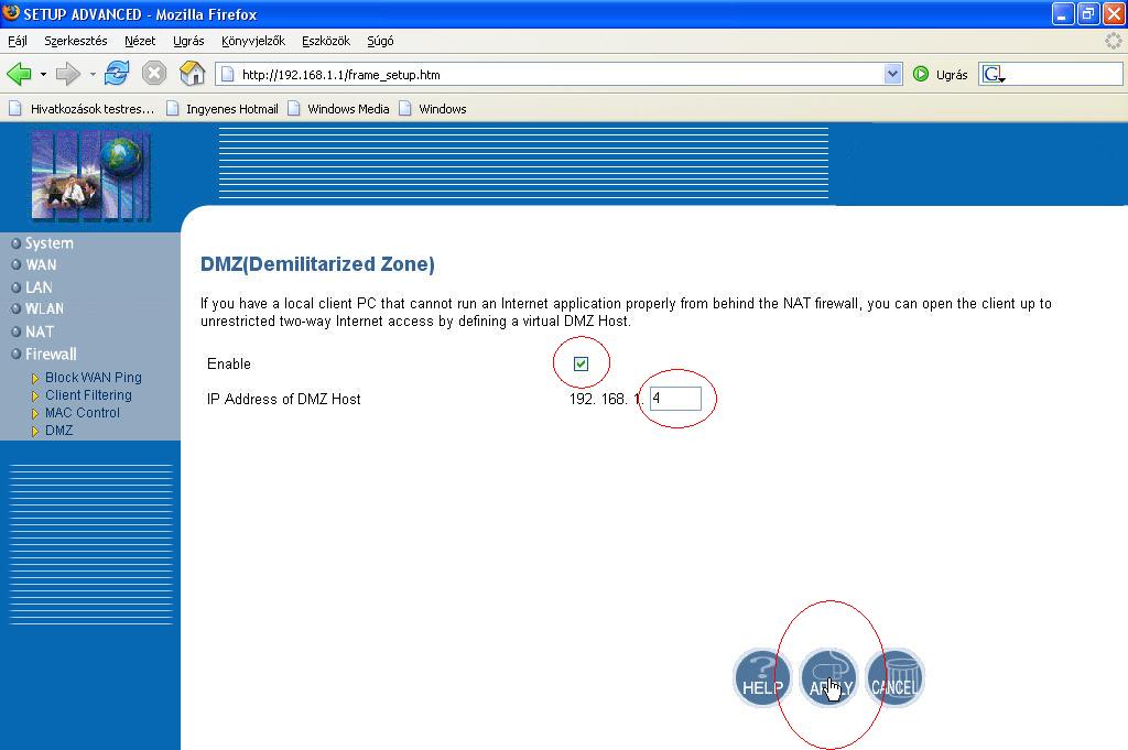 Ebben az opcióban egy host-ot kell létrehoznunk a saját számítógépünknek, arra az IP címre, melyet a router generált nekünk. Ezt az IP-t megtalálod a Vezérlőpult/hálózati kapcsolatok-ban, ha jobb gombbal a helyi kapcsolatra kattintasz, majd az "állapot"-ra, és itt a "támogatás" fülre. A felsoroltak között kell találnod egy olyat, melynek IP cím a neve, és egy számsor (segítségként kép: itt). Ennek a sornak az utolsó részét kell beírnod a router beállításainál a DMZ host mezőbe, hogy a teljes sor megegyezzen a te IP-del, melyet a routertől kaptál. Jelen esetben ez: 192.168.1.4 ezért a router beállításaiban egy 4-est írok az üres téglalapba. Ez után engedélyezzük az "enabled" négyzet kipipálásával, majd kattintsunk az "apply" gombra. kép: itt.