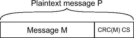 First a checksum of message M is computed so the message integrity can be checked later. This is done using a 32-bit cyclic redundancy checksum function aptly named CRC32. This checksum will be called CS, so CS = CRC32(M). This value is appended to the end of the message, which makes up the plaintext message P.