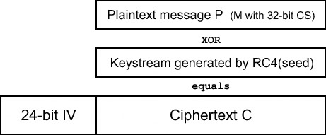 Then the seed value S is fed into RC4, which will generate a keystream. This keystream is XORed with the plaintext message P, to produce the ciphertext C. The IV is prepended to the ciphertext, and the whole thing is encapsulated with yet another header and sent out over the radio link.