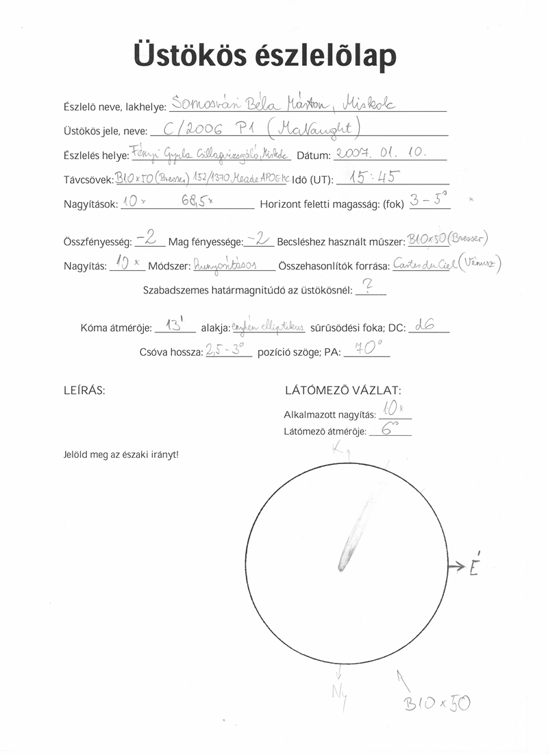 A Vénuszt szabad szemmel pillantottam meg először, nem sokkal a McNaught "felfedezése" előtt. A bolygó fényességéhez képest az üstökös kb. -2 magnitúdósnak adódott.