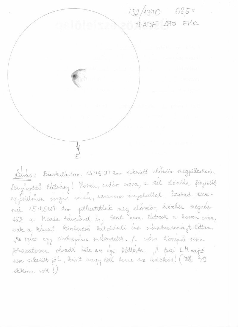 Ahogy sötétedet, egyre jobban kivehetővé vált az üstökös hosszú csóvája is. Binokulárban legalább a látómező felén keresztül követhető volt. EZ kb. 2.5-3 fokot jelent. Gyorsan belőttem a keresőtávcsővel is az üstököst, és így már együtt a szakkörösökkel meg tudtuk nézni a MEADE távcsővel is. Mindenkinek nagyon tetszett a gyönyörű égi jelenség, teljesen le voltunk ragadtatva! Az apokromáttal a kóma a látómezőnek kb. 1/15-ét tehette ki. A csóva két oldala fényesebb volt (ezt binokulárban is érzékeltük), szépen, ívesen indult és seprűre emlékeztető kontúrja volt. Narancsos-sárgás színű volt az üstökös.