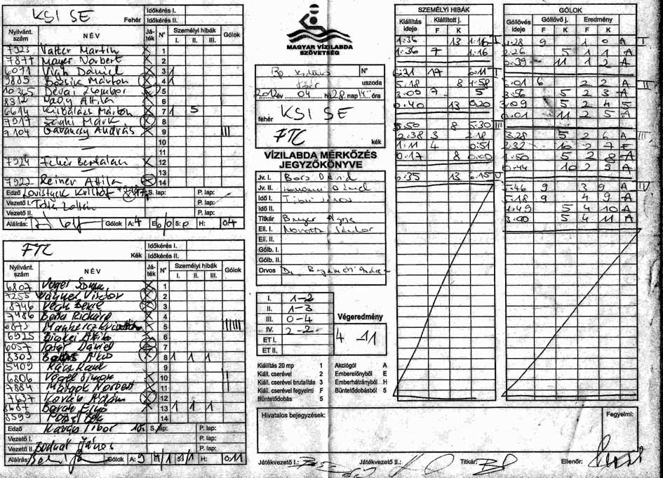 - Víz feletti ököllel ütés, a 4 perces helyett először páros kiállítást ítél, majd végleg cserével kiállítja a megütött játékost.