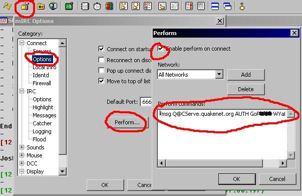 6. Másold be a parancssort a mIRC Perform részébe (mIRC Options - Options - Perform) a képen látható módon (a pirossal jelölt pipa is fontos, hogy legyen)