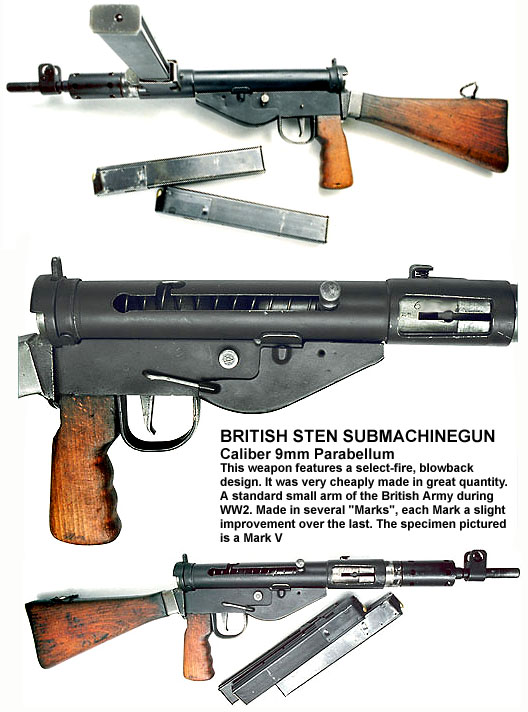 A Sten Mark 2 egy egyszerűen gyártható, lemezelt fémből készült géppisztoly volt. 6 különböző verziót gyártottak belőle, például a kommandósok részére hangtompítós változatban. 9mm-es Parabellum lövedékeket használt, 32 töltény fért a tárba, súlya 3 kg, tűzgyorsasága 550 lövés/perc.