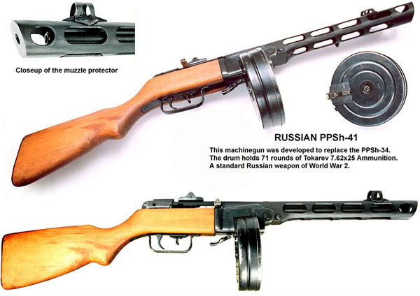 A PPSh-41 a Vörös Hadsereg könnyen előállítható, megbízható fegyvere. Az orosz télben is muködésképes maradt, így gyakran a németek is használták a zsákmányolt fegyvereket. Könnyen megismerhető fa puskatusáról, és a dobtárról. A dobtár 71, míg a sima tár 35 darab 7. 62-es töltényt tartalmazott. Tűzgyorsasága 900 lövés/perc.