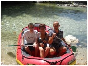 Szerdán úgy döntöttünk, meglátogatjuk az Aheron folyót. Előtte házigazdánknál bevetettük a pálinkázós módszert, így pontos képet kaptunk a helyszín megközelítéséről. Aki ezen a környéken jár, az ne hagyja ki ezt a programot. Mihelyt leparkoltunk, még szét sem tudtunk nézni, máris letámadtak bennünket, hogy menjünk raftingolni. Még soha nem tettünk ilyet, de biztosítottak bennünket, hogy nem veszélyes, ezért engedtünk az újdonság varázsának. Nem bántuk meg. Térdig, mélyebb helyeken nyakig érő, sebes sodrású, gyönyörű átlátszó víz. Egy görög párral, ötösben eveztünk. Természetesen volt képzett kísérőnk, aki a megfelelő pillanatban kiadta az utasítást az evezésre. Kár, hogy nem kísért bennünket egy külső kamera.