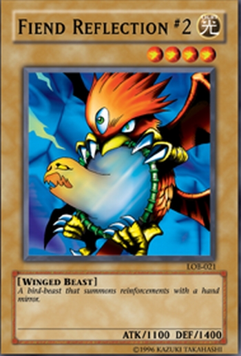 Y | Fiend Reflection #2 [Winged Beast] Wind **** ATK/1100 DEF/1400 Egy madár bestia, ami kézitükrével erősítést idéz. |
