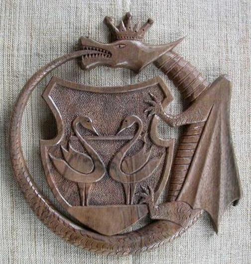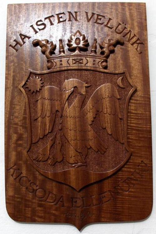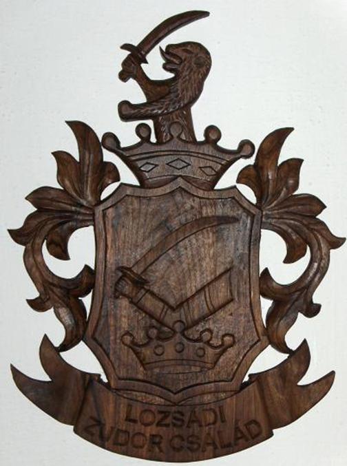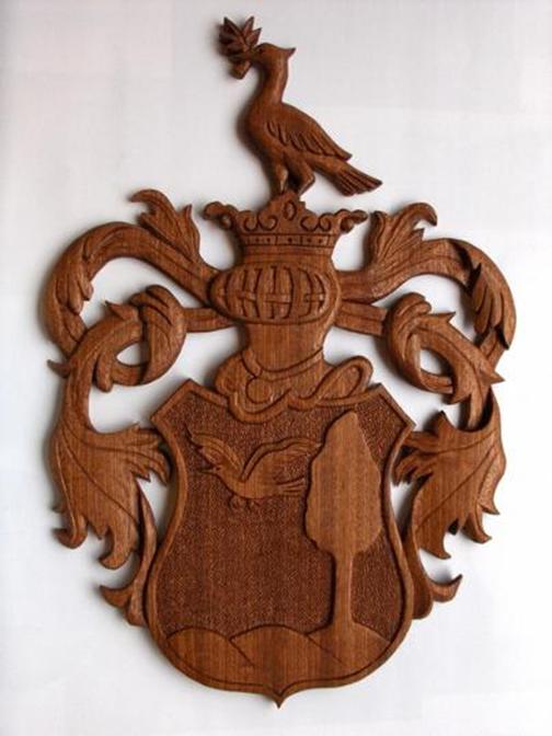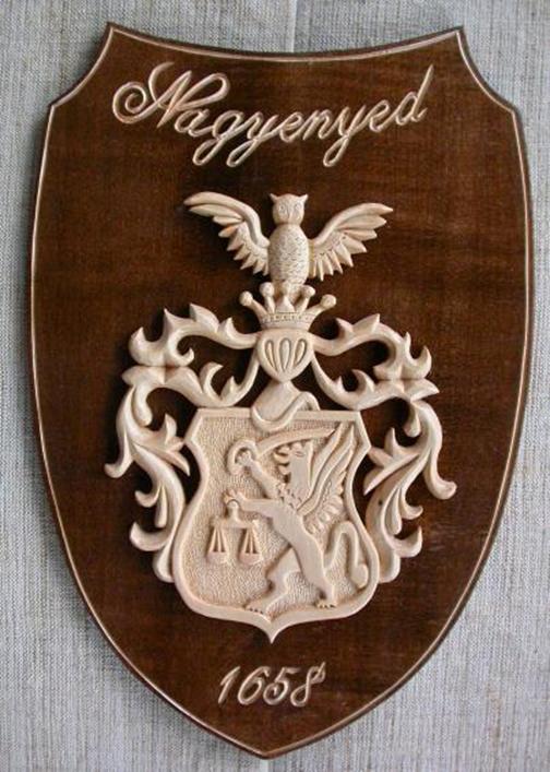 Családi címer. Diófából, mahagóniból, cseresznyefából vagy tölgyfából készülnek a címerek. Hátlappal, vagy anélkül.