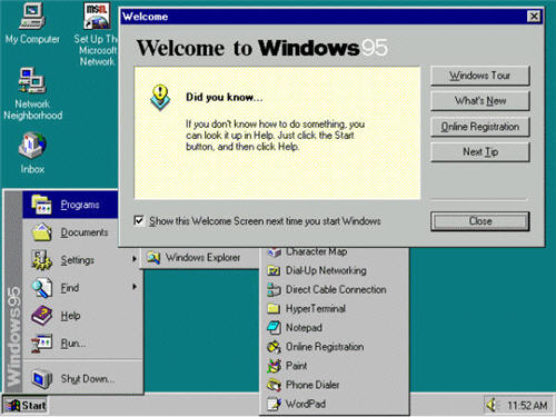 A Windows 95-ben került bevezetésre az azóta is minden Windows operációs rendszerben megtalálható Start gomb, ahonnan indíthatóak a programok és egyéb műveletek.