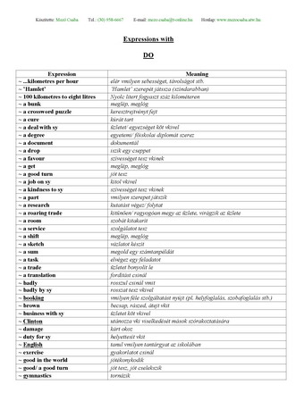 Expressions with DO / GET / HAVE / MAKE / TAKE szerkezetek, kifejezések magyar jelentésükkel.