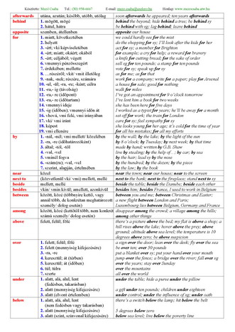 Prepositions, Adverbs - Elöljárók, határozószók gyűjteménye magyar jelentésükkel, konkrét példákkal.
