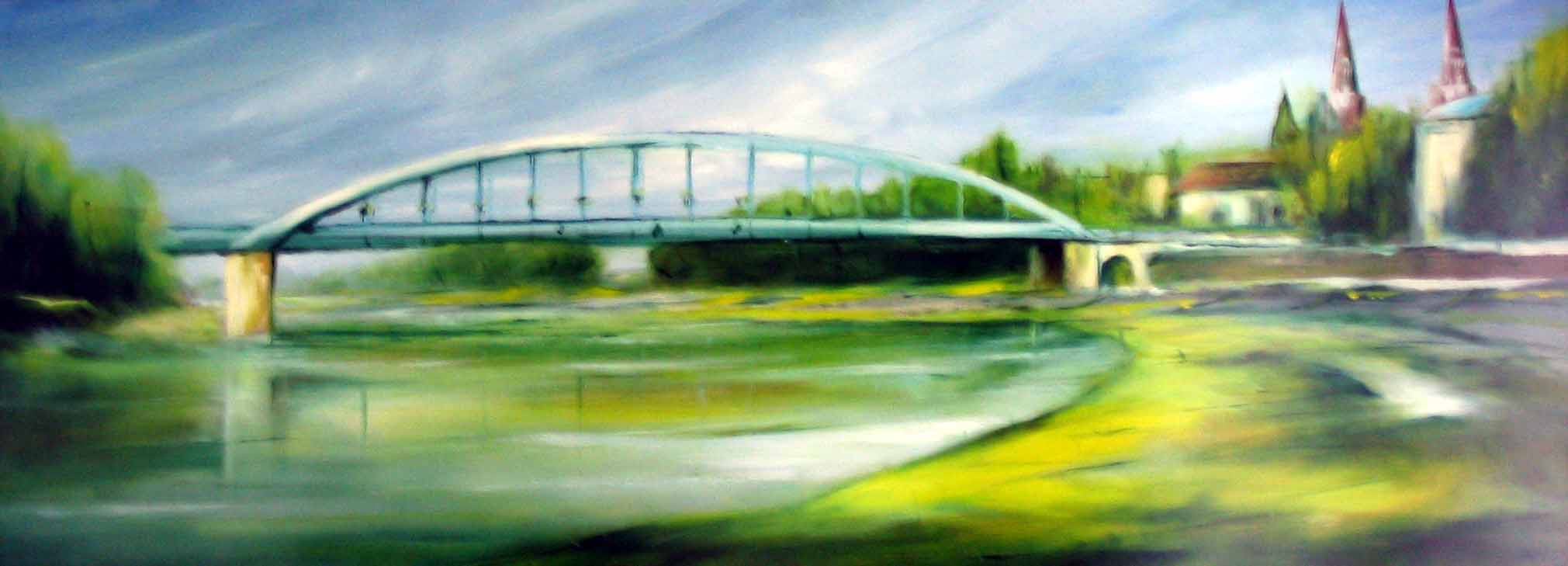 Downtown bridge over the Tisza (oil/wallboard), private property 2003