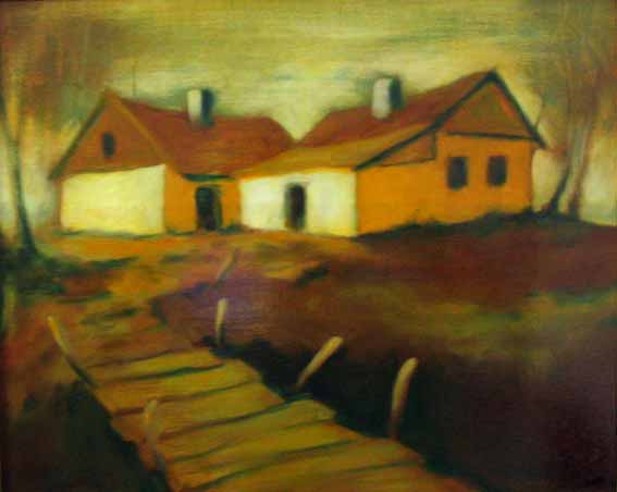 Farms on the bank of river Tisza (oil/wallboard), private property 1997