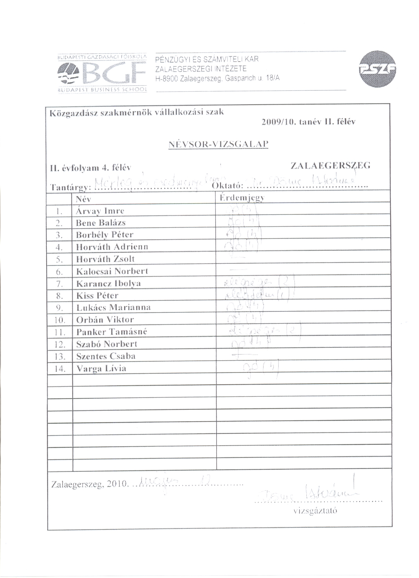 Termelésmenedzsment vizsgaeredmények