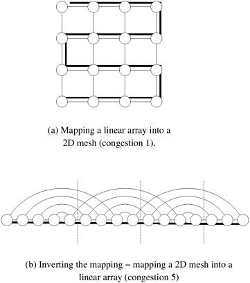 This mapping of a mesh into a hypercube has certain useful properties. All nodes in the same row of the mesh are mapped to hypercube nodes whose labels have r identical most significant bits. We know from Section 2.4.3 that fixing any r bits in the node label of an (r + s)-dimensional hypercube yields a subcube of dimension s with 2s nodes. Since each mesh node is mapped onto a unique node in the hypercube, and each row in the mesh has 2s nodes, every row in the mesh is mapped to a distinct subcube in the hypercube. Similarly, each column in the mesh is mapped to a distinct subcube in the hypercube. Embedding a Mesh into a Linear ArrayWe have, up until this point, considered embeddings of sparser networks into denser networks. A 2-D mesh has 2 x p links. In contrast, a p-node linear array has p links. Consequently, there must be a congestion associated with this mapping. Consider first the mapping of a linear array into a mesh. We assume that neither the mesh nor the linear array has wraparound connections. An intuitive mapping of a linear array into a mesh is illustrated in Figure 2.32. Here, the solid lines correspond to links in the linear array and normal lines to links in the mesh. It is easy to see from Figure 2.32(a) that a congestion-one, dilation-one mapping of a linear array to a mesh is possible. Figure 2.32. (a) Embedding a 16 node linear array into a 2-D mesh; and (b) the inverse of the mapping. Solid lines correspond to links in the linear array and normal lines to links in the mesh.