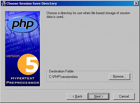 Finally, edit Apache's configuration file httpd.conf (or alternatively, srm.conf) to map the PHP file extension to PHP. You can choose any file extension you like, even .html, but the recommended "official" extension is .php: AddType application/x-httpd-php .php This installed PHP as a static module in Apache. If you want to create a dynamic module (DSO), you first have to change the configure parameters for PHP: $ ./configure --with-apxs=/path/to/apxs --with-mysql Replace --with-apxs with --with-apxs2 if you want to use Apache 2.x; however, note that PHP's Apache module still is considered experimental by the developers. You can skip the Apache configuration step, but make sure to include the correct lines in httpd.conf (the first two of these should be added automatically by the install process): LoadModule php5_module libexec/libphp5.so AddModule mod_php5.c AddType application/x-httpd-php .php As a last step, copy the file php.ini-dist that comes with the PHP sources to /usr/local/lib, rename it to php.ini, and edit it, if applicable. Then you are ready to gowrite a small test script, for example, one of the following kind: <?php phpinfo(); ?> WindowsAs mentioned previously, the Windows binaries come as both a GUI installer (see Figure A.2) and as a Zip file. The installer seems to be especially convenient; it even creates directories for session variables and uploaded files, some things that you do not get automatically if you install PHP from the Zip archive. However, there is a compelling disadvantage with the installer: It does not come with any extensions, thus limiting your flexibility. Figure A.2. The Windows PHP installer.