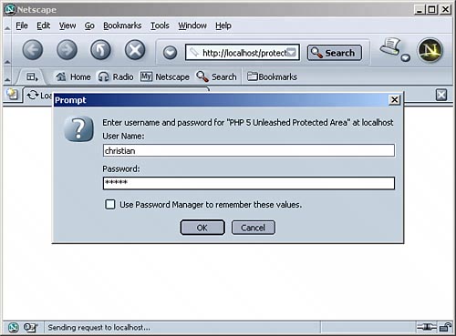 Thus, to retrieve the username and password for both Apache and IIS, the following code (see Listing 11.6) comes in handy: Listing 11.6. The Username and Password Are Retrieved for Both Apache and IIS
