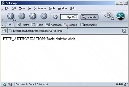 You see that the value of HTTP_AUTHORIZATION starts with Basic, then a blank, then some garbage. However, if you look closely, you see that the characters after Basic could be Base64-encoded text. Thus, change the previous listing to the code shown in Listing 11.5 (the result can be seen in Figure 11.5): Listing 11.5. Using base64_decode(), the User Data Is Readable
