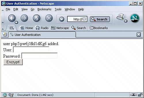 Of course, this code can be easily extended. For instance, you could have a whole list of valid usernames and passwords. Imagine a file where usernames and (encrypted) passwords are stored in this format: username:encrypted_pw The encryption is done using PHP's crypt() function. As a first parameter, the password is submitted; as a second parameter, we use the string constant "pw". The following PHP script (see Listing 11.8 and Figure 11.6) lets the administrator enter a username and a password and writes the associated entry into a password file, using crypt(): Listing 11.8. Passwords Are Encrypted and Saved in a File
