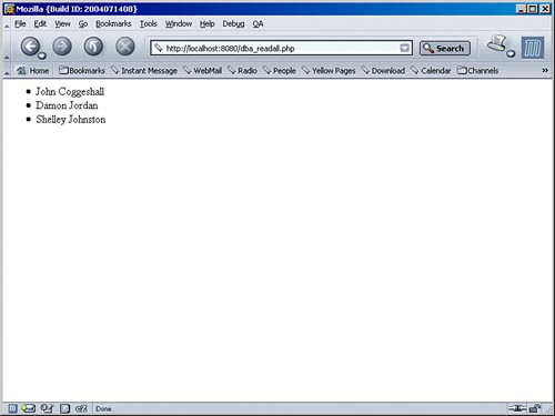 Figure 26.2 shows the output of Listing 26.6 using the sample data entered into the database using Listings 26.126.5. Figure 26.2. All data in the database.![]() If you are curious, this is how the file now looks (remember, we used flatfile): 4 John10 Coggeshall7 helley7 Johnson5 Damon6 Jordan7 Shelley8 Johnston4 ill5 Gates A space character at the beginning of a line hints that this entry is deleted (but still consumes space in the database file). And that's basically all you need to know about PHP's dba functions. There are, however, other dba functions worth mentioning: