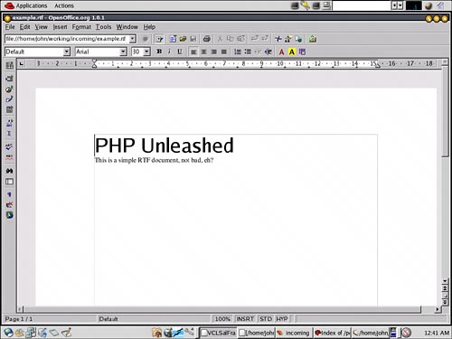 As you can see, this document could have easily been generated using a simple text editor. When opened up in a word processor such as Open Office, Microsoft Word, or any other major word processor, it is rendered as follows. However, as simple as the preceding RTF example is, it is by no means representative of the vast majority of RTF documents generated. Most RTF documents are incredibly complex and difficult to decipher by hand or even with a computer application. Figure 28.1. An example of a trivial RTF document when rendered.![]() Although RTF documents can be quite difficult to fully implement, one extremely important fact can be taken from our simplistic example. Because the actual content of the document is stored as plain text within the RTF file, almost any word processing application can be used to generate a template that can be filled in via a third entity such as a PHP script. With this in mind, generating dynamic RTF documents can be broken into these simple steps: