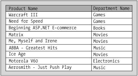 Name Name ---------------------------------- ------------------ Warcraft III Games Need for Speed Games Beginning ASP.NET E-Commerce Books Matrix Movies Me, Myself, and Irene Movies ABBA - Greatest Hits Music Ice Age Movies Motorola V60 Electronics Aerosmith - Just Push Play Music