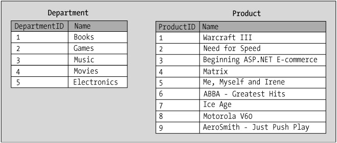 The ProductDepartment table shown earlier contains data about products and departments. In a normalized data structure, you would store them in separate tables, as shown in Figure 1-3.