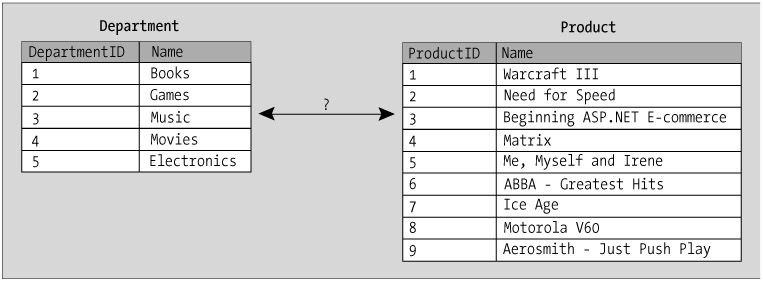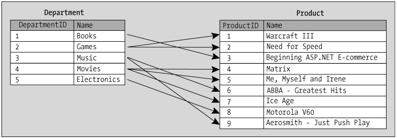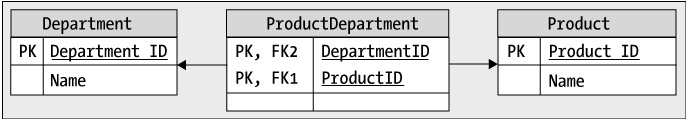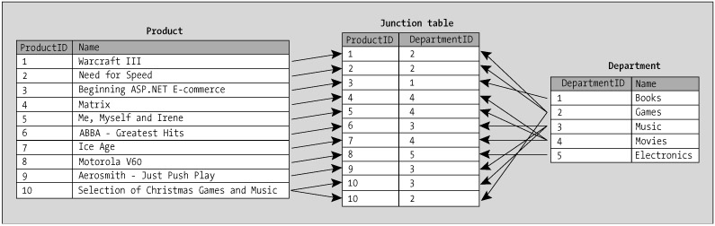 You'd need this kind of relationship for the scenario if you want to support adding products that can be part of more than one department, such as a product named Selection of Christmas Games and Music. This product should be found in both the Games and Music departments. So how do you implement this into the database?