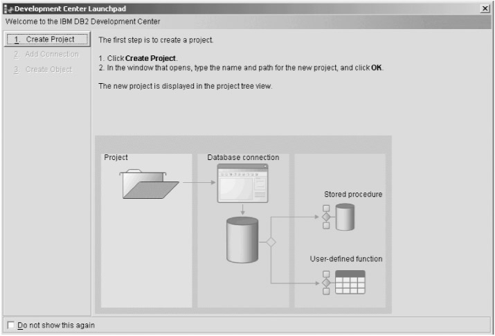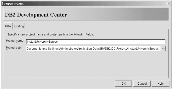 To create a DB2 stored procedure, start by opening Development Center. You'll be invited to create a new project, as shown in Figure 9-1.