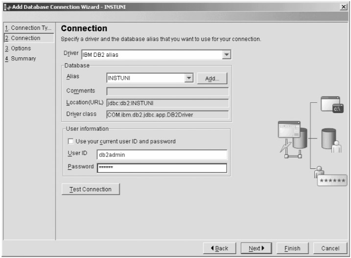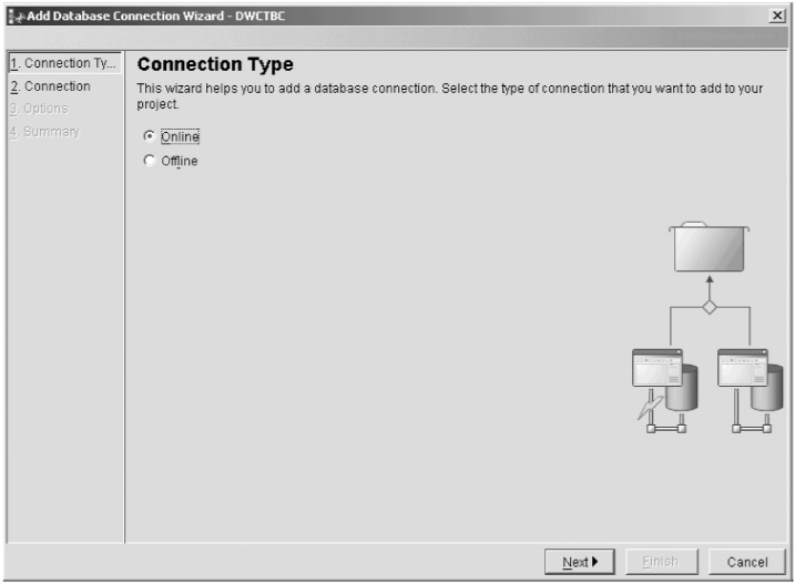 The next task is to connect to the InstantUniversity database. First, you have to specify whether you want to work offline or you want to connect to the DB2 server. Ensure that Online is selected and click Next, as shown in Figure 9-3.