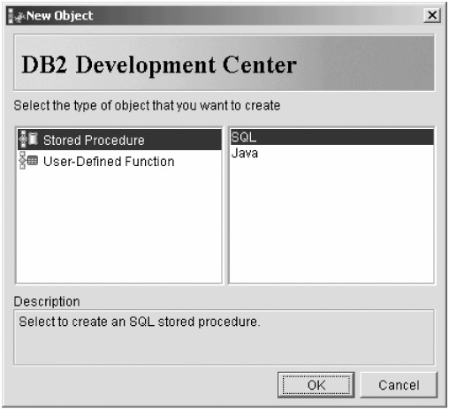 Enter the alias for the InstantUniversity database (INSTUNI in this case) and the ID and password of the user account you want to connect with, and then click Next. You're now asked whether you want to create a stored procedure or User-Defined Function (UDF) and whether you want to write it in SQL or Java, as shown in Figure 9-5.