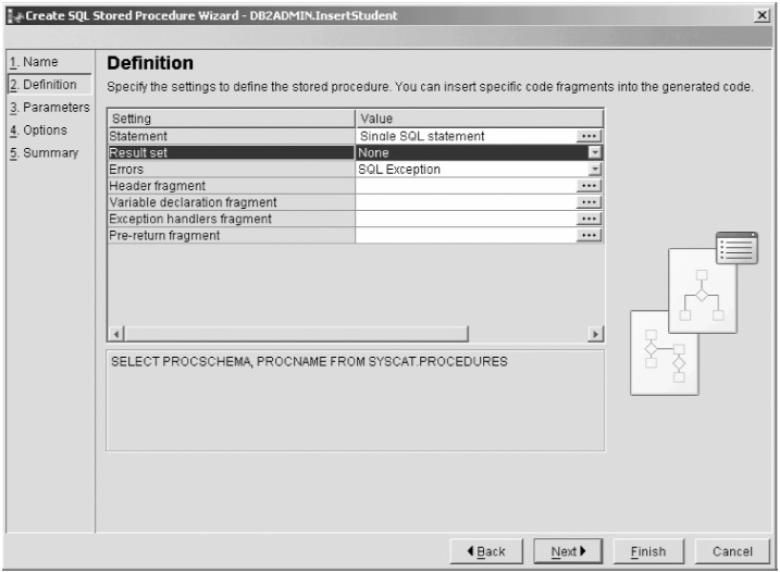 DB2 provides a wizard that creates the SQL statements for the stored procedure, but this is a SQL book, so you're going to do this manually. DB2 allows stored procedures to return none, one, or more result sets; this first example doesn't return a result set, so select None for the Result Set field and then click Finish, as shown in Figure 9-7.