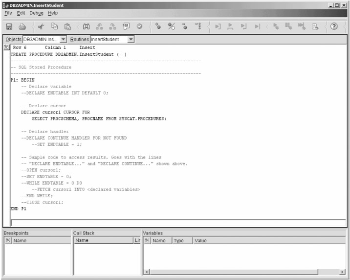 Back in the main Development Center window, open the stored procedure by double-clicking it. DB2 has added some default SQL code to create the procedure, as shown in Figure 9-8.