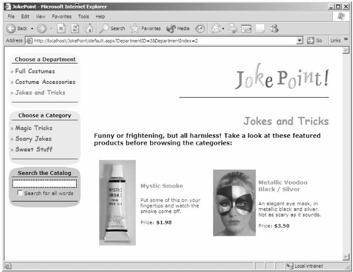 You can see the list of departments listed in the left side of the page. Underneath, you can see the list of categories that belong to the currently selected department (which in this case is Jokes and Tricks). The rest of the page is filled with products.