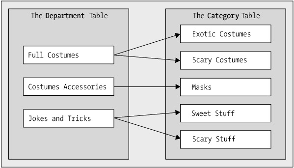 We decided earlier that a department can contain multiple categories, but a category always belongs to a single department. This is a one-to-many relationship, and it can be imagined as in Figure 14-2 (one department, many categories).